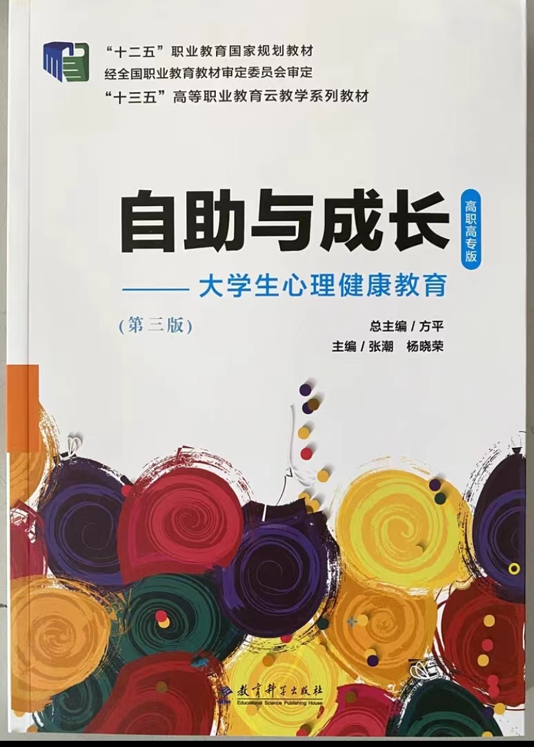 根据高等学校心理健康教育指导要求,结合我院心理健康教育课程教学实际,选用此“十三五”高等职业教育云教学系列教材。《自助与成长:大学生心理健康教育(第三版)》(高职高专版)由张潮,杨晓荣主编,教育科学出版社出版,2020年版本。本书以“心理学堂”、“心海扬帆俱乐部”等板块呈现教学内容,以“成长案例”、“心理词典”等形式帮助大学生解读心理健康的基础知识和基本规律,让学生在活动中体验、在感悟中成长,培养学生进行自我心理健康教育的能力。