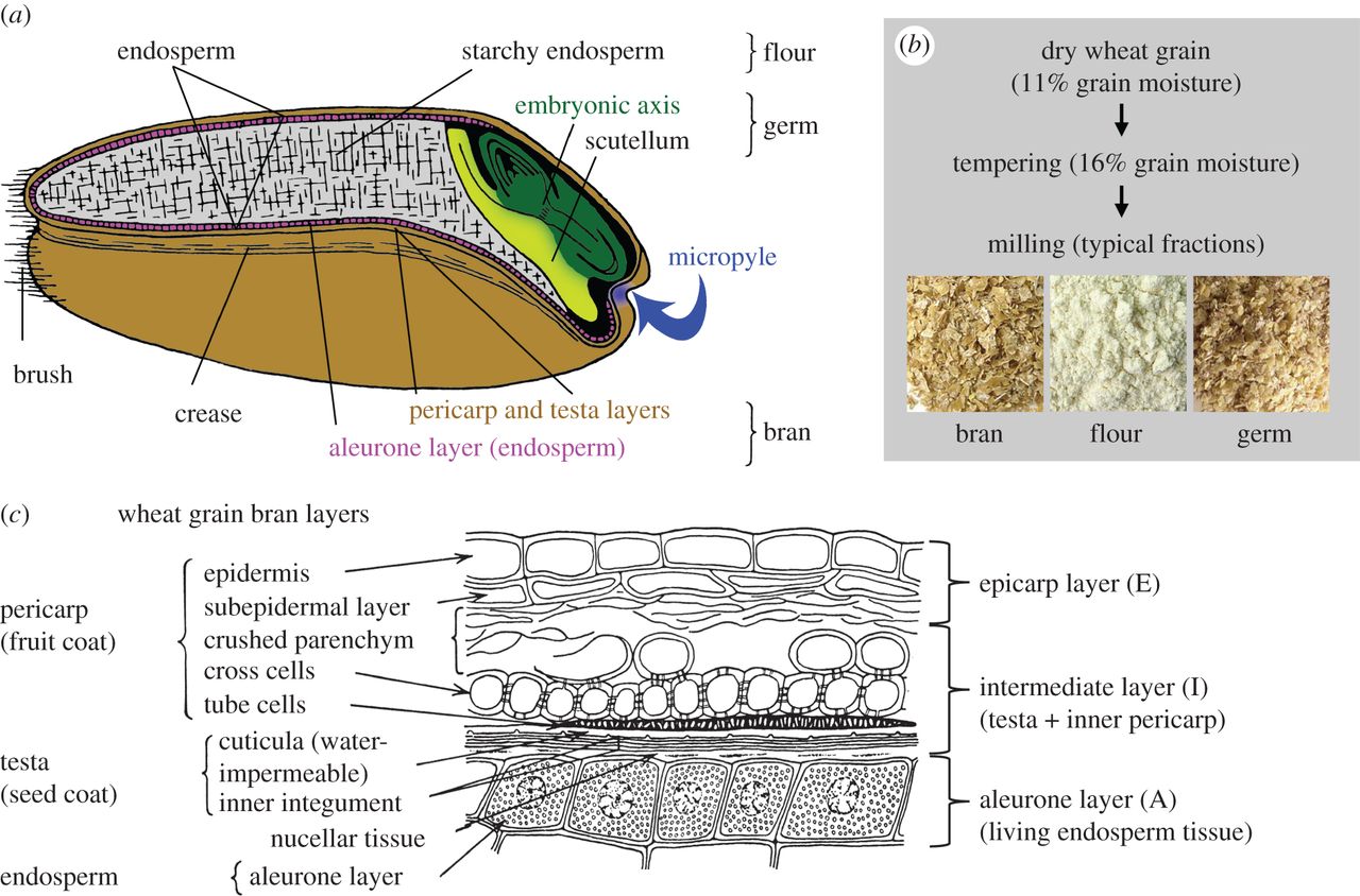 面粉来自小麦种子的胚乳(磨面时去掉的果皮,种皮,胚等组织就是通常所说的麸皮),而胚乳就是个由淀粉和蛋白质组成的营养储存仓库,为小麦种子萌发提供营养。