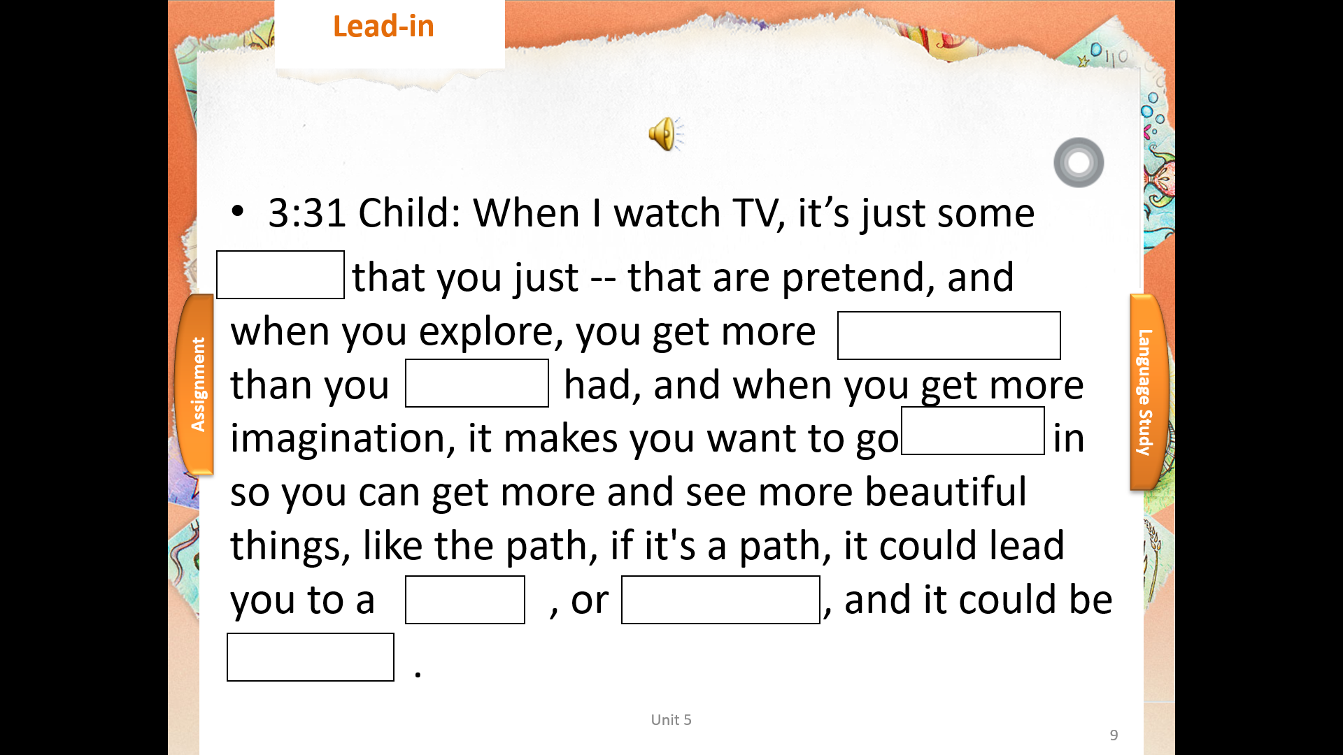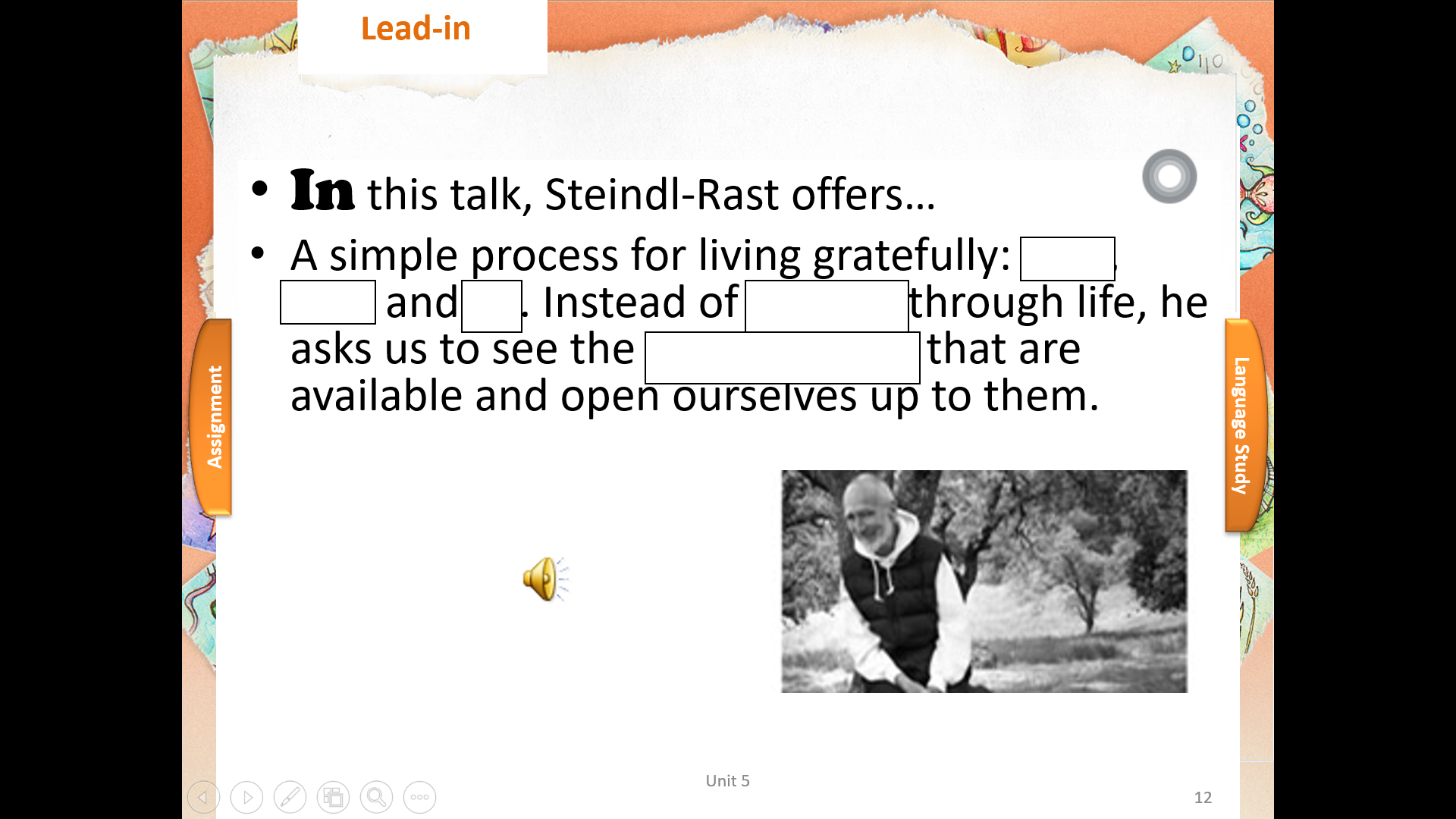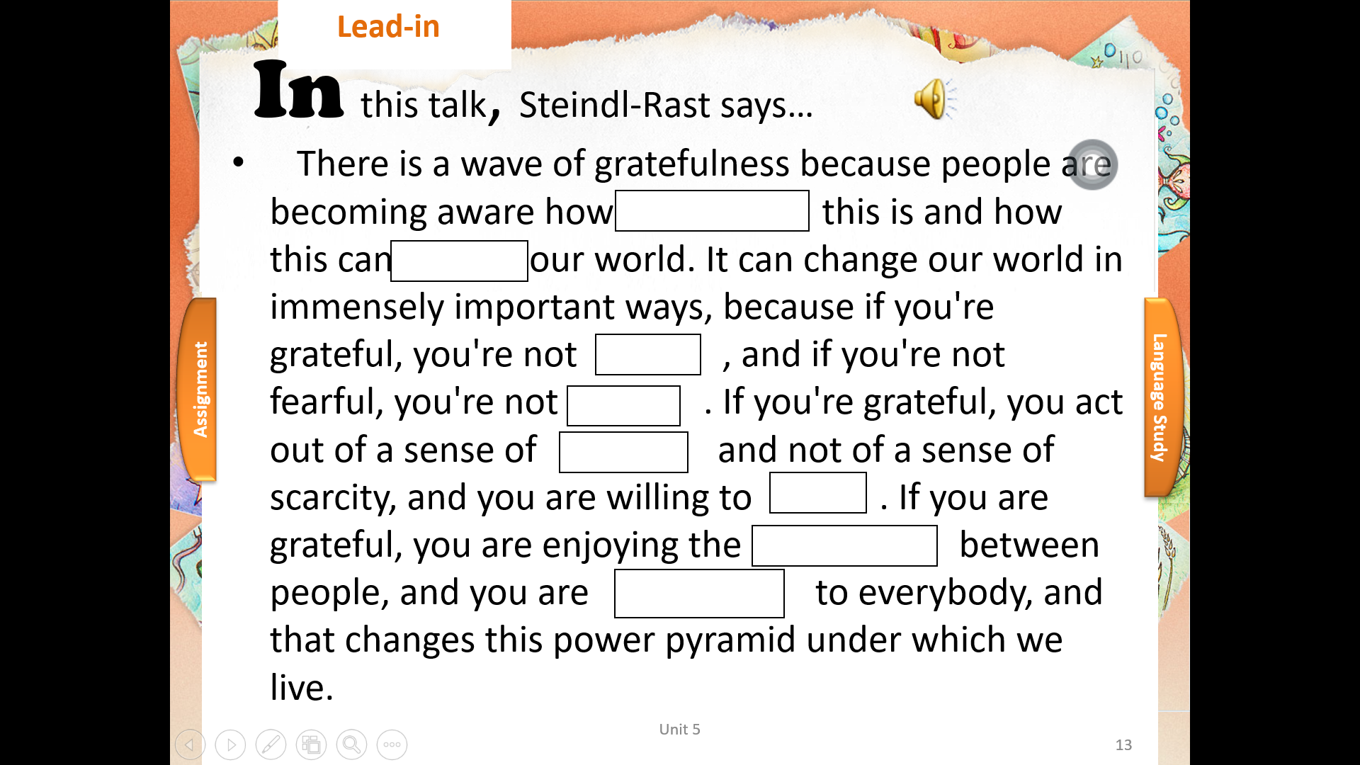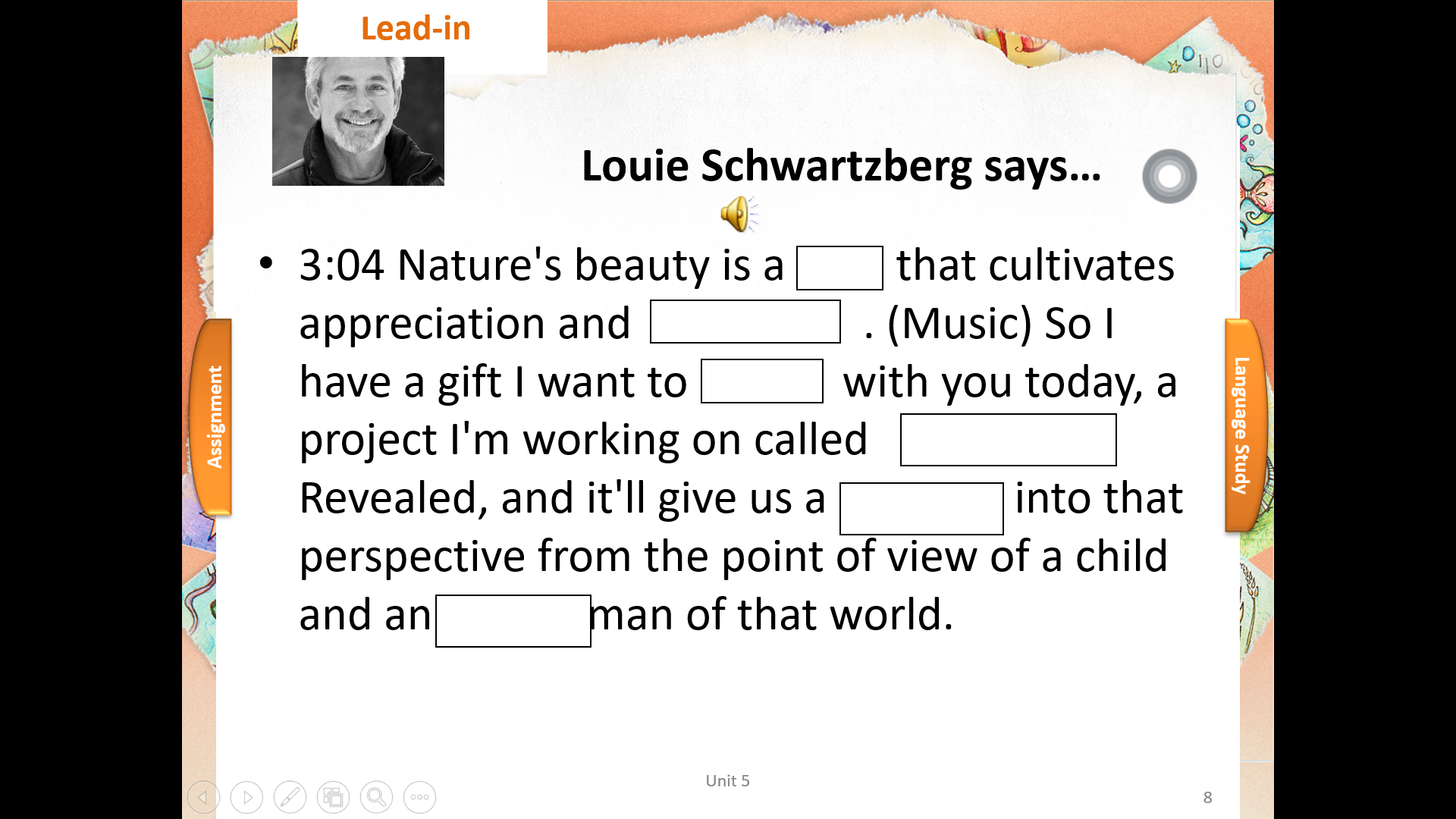 In this part, students will be introduced to the theme by brainstorming, video clips, and speaking tasks.