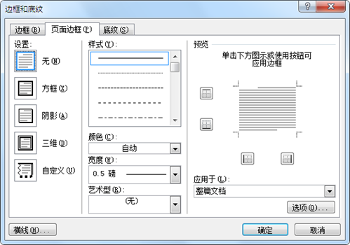 对文本加边框和底纹.选定要加边框的文本。单击“页面布局”功能区/“页面背景”分组中的“页面边框”按钮,打开如图所示的“边框和底纹”对话框。在“页面边框”选项卡的“设置”、“线型”、“颜色”、“宽度”等列表中选定所需的参数。 在“应用范围”列表框中用选定为“文本”。在预览框中可查看结果,确认后单击“确认”按钮。
