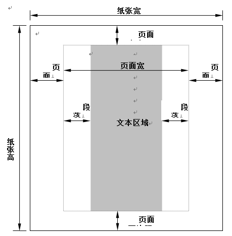 纸张的大小、页边距确定了可用文本区域。文本区域的宽度等于纸张的宽度减去左、右页边距,文本区的高度等于纸张的高度减去上、下页边距,如图所示。