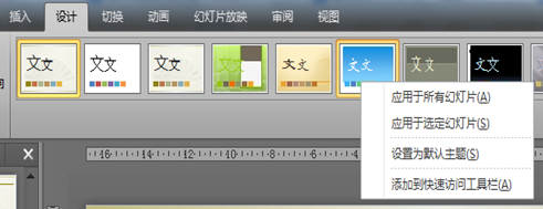 为演示文稿应用主题。【设计】/【主题】组,在主题标识上右击鼠标,出现快捷菜单,选择“应用于所有幻灯片”。