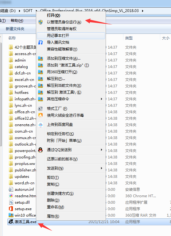 4. 右击“激活工具”,选择“以管理员身份运行”,单击激活窗口中的第三个按钮“激活office2010-2019ProPlus”,等待界面出现“激活成功”就可以了。