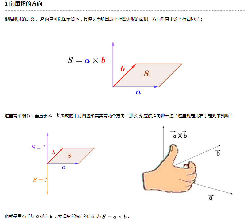向量积的值是一个向量,方向由右手定则决定,垂直于两向量所成平面。