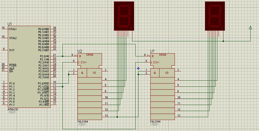 2. 51单片机的串口通过连接2个移位寄存器74LS164与2个数码管相连,通过串口控制数码管显示00~99,每隔500ms数值变化1次。(仿真实现)