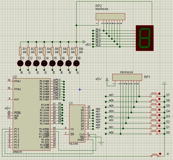 3. 51单片机的串口通过连接1个移位寄存器74LS165,1个数码管,8个按键和8个LED灯,通过串口读入开关状态,控制8个LED灯的亮灭以及数码管显示1~8。(仿真实现)