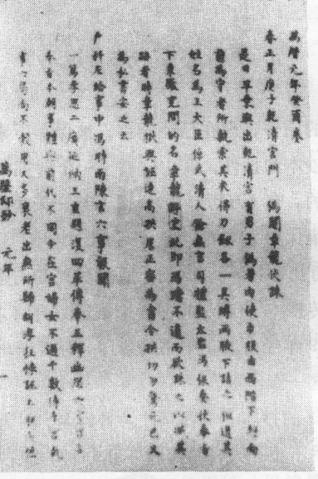 明代内外文武官员的条奏和各政府部门的本章,均由通政司收受后,根据不同内容分送有关衙门处理。特别重要的事情,则呈请皇帝裁决。凡是要送呈皇帝审阅的章奏,送入大内后,由司礼监根据皇帝的旨意,用笔批覆,称为“批红”,再交还内阁。内阁将经过审批的章奏,根据各自管辖的范围分别交给六科,由六科抄发给各部院。