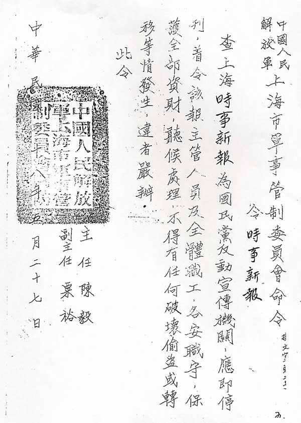 1948年11月8日,中共中央颁布了《关于新解放城市中中外报刊通讯社处理办法的决定》,指出: “报纸刊物与通讯社是一定的阶级、党派与社会团体进行阶级斗争的一种工具,不是生产事业,故对于私营报纸、刊物与通讯社,一般地不能采取对私营工商业同样的政策”。清理、接管工作的基本原则是“保护人民的言论、出版自由,和剥夺反人民的言论出版自由”。