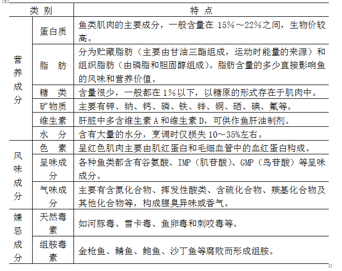 | 案例问题 | 1、鱼类的化学成分与菜肴风味的形成有什么关系? 2、从营养、卫生、风味三方面比较养殖鱼类与野生鱼类。 | |||