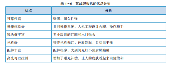 第一步:分析该品牌相机的优点(见表 4 - 6)。