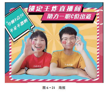 直播间海报的设计是直播宣传的重要手段,从人物照片的拍摄选择,到文字的搭配,再到海报的色彩设计,都要符合本次宣传的主要意义,展现出重要的信息,请你仔细观察所给海报(见图 6 - 21)