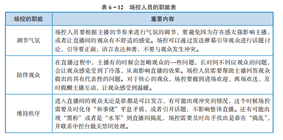 在直播电商团队中,场控也是重要的幕后工作人员,承担着活跃直播间气氛,加强粉丝互动的重要任务,同时还能帮助主播回答粉丝的问题。站在粉丝的角度去分析产品更加具有说服力,如果出现不好的言论的时候也可以及时地调整站位,发表正面言论,做好引导工作(见表 6 - 12)。