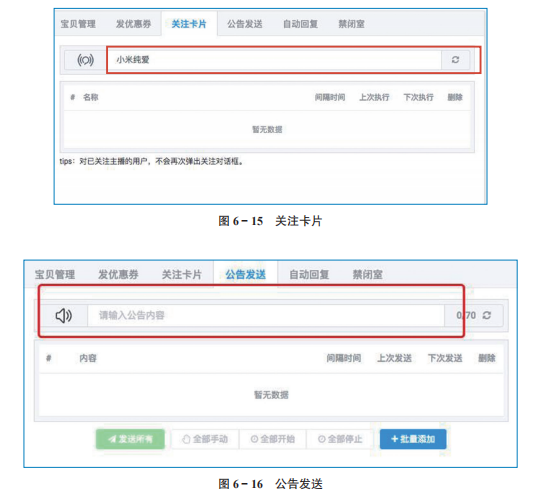 (3)公告发送功能。直接在对话框中输入内容即可,也可进行定时设置,如在需要调动直播间气氛的时候,或者配合主播的活动推出时间进行设置。例如,上架倒计时、红包雨的发送时间,关注后有什么样的优惠等都可以进行公告发送(见图 6 - 16)