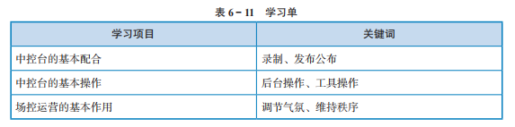 工作室老师为了让王新更多地了解直播配合的重要性,又给王新布置了新的任务。他让王新在完成任务的过程中了解在直播过程中应如何与中控台配合,中控台具体应如何设置等。王新为自己制订了学习单(见表 6 - 11),用以梳理中控台的基本配合等相关知识。