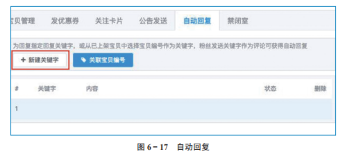 (4)自动回复功能。将用户经常问的问题进行梳理,设置统一回复,可以减少主播和客服的压力,或者对已经上架的宝贝进行关联设置,直播间内的观众在提到相关产品时也可以收到自动回复(见图 6 - 17)。