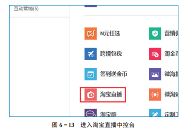 进入营销工作台,下拉页面,然后点击“查看全部工具”,在其中找到“淘宝直播”,点击即可进入中控台(见图 6 - 13)。