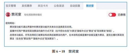 (5)禁闭室。禁闭室开启后可以选择启用和停用,在中控台右侧“大家说”面板中可以直接点击“禁言”或“取消禁言”按钮(见图 6 - 18)。