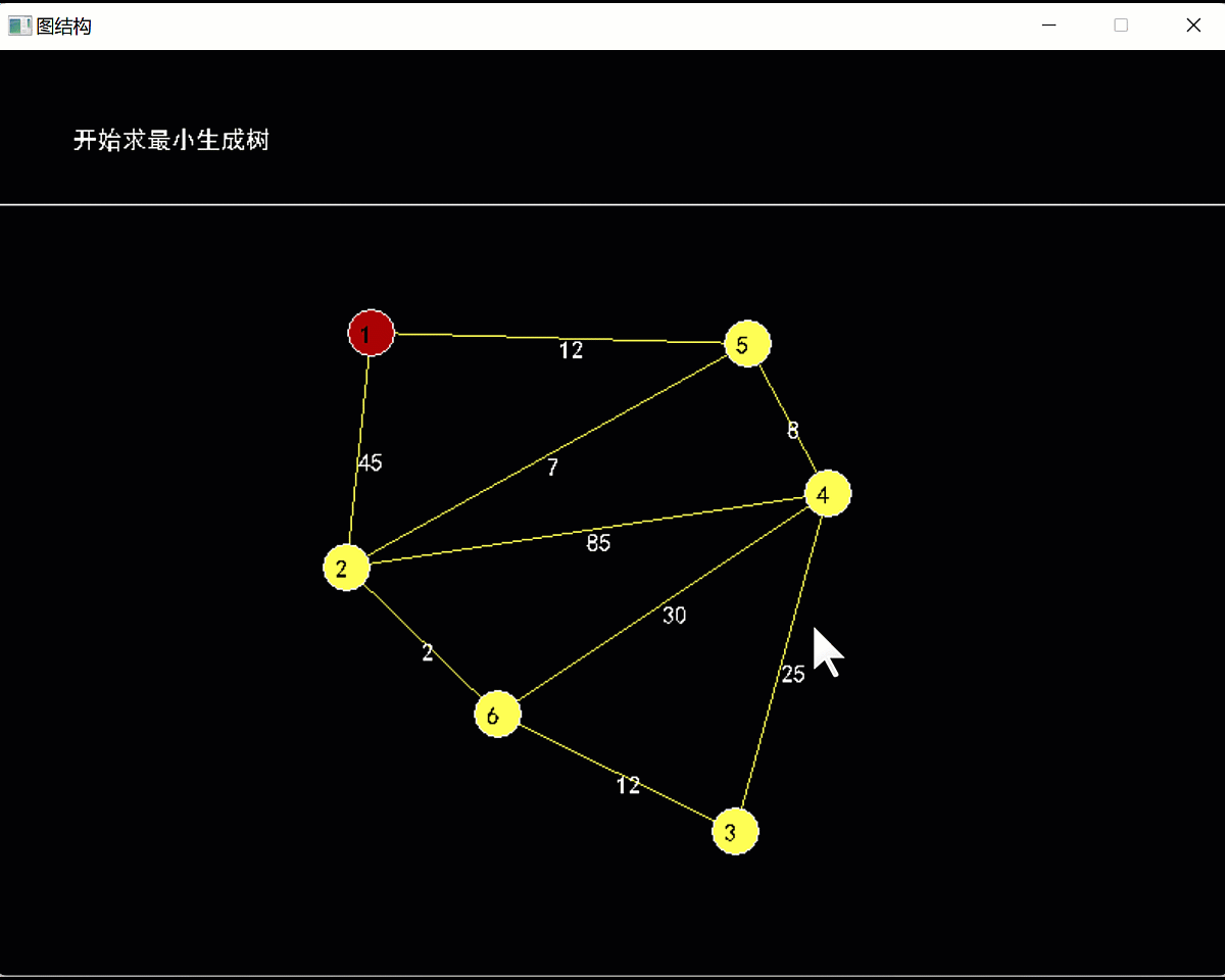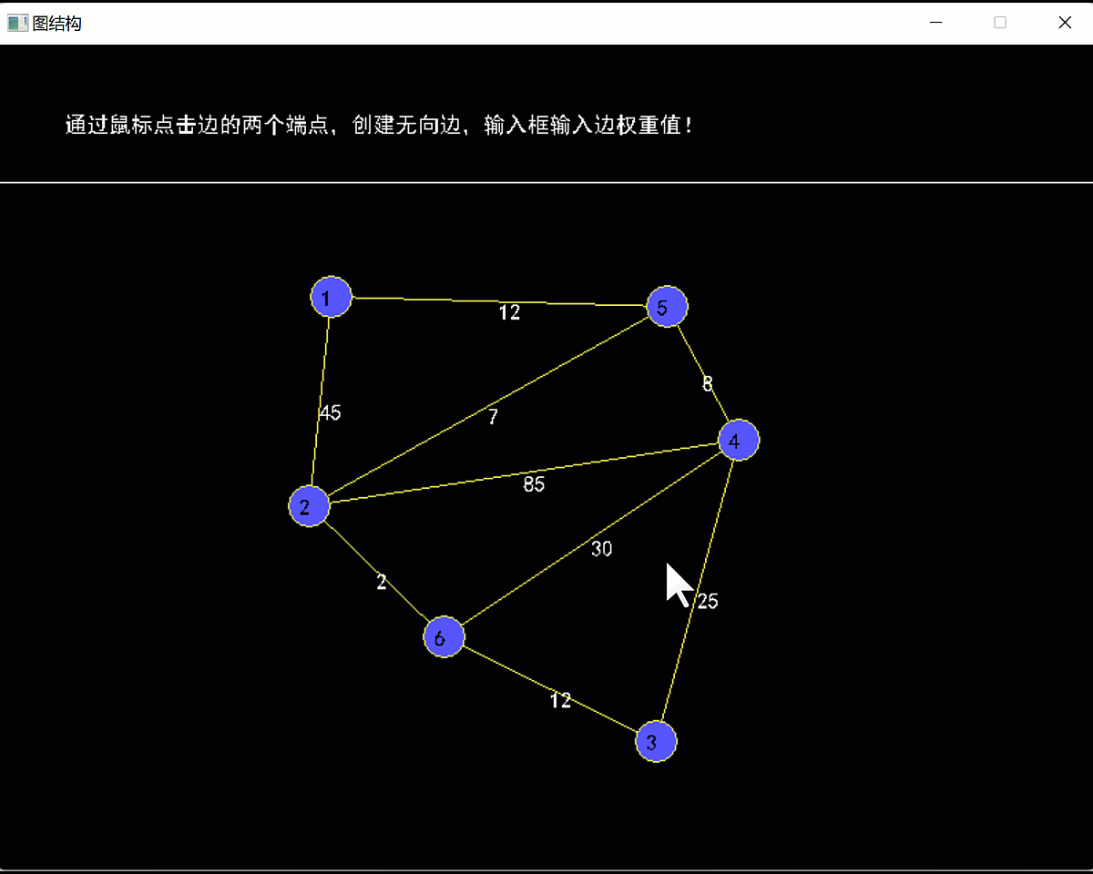 利用EasyX实现在窗体中,通过鼠标交互方式,在窗体中绘制图的顶点,并通过鼠标选择边的端点,再利用输入框输入无向边的权重值,从而创建出图,并利用图的邻接矩阵的存储结构存储图信息。创建图后,利用深度优先遍历方法,遍历图中的各节点,若为连通图,则利用Prim算法求图的最小生成树。参考效果如下: