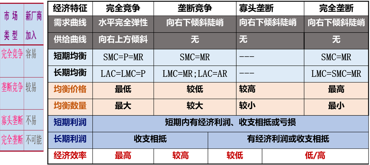 经济效率:完全竞争 > 垄断竞争 > 寡头垄断 > 完全垄断市场。