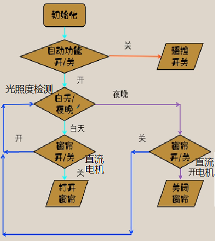 以卧室窗为例,设计一个窗帘自动开闭管理模块,实现窗帘据时间、光照等因素自动开闭,可手动控制。