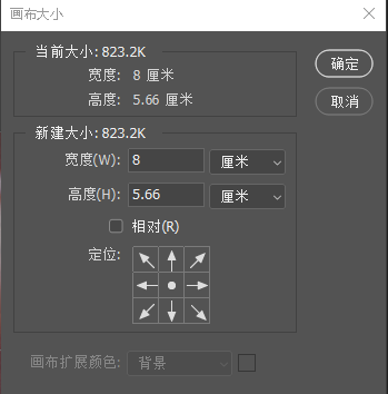在该对话框中,若不选择“相对”复选框,则直接在“新建大小”区域”宽度“和”高度“文本框中输人一个值,即为调整后的画布大小;若勾选“相对”复选框,“新建大小”区域”宽度“和“高度"值会自动为0,在其中输入数值后表示在当前画布大小的基础要加或减去该数值,正值表示扩大画布,负值表示减小画布;若调整后的画布尺寸小于图像尺寸,则图像会被裁剪。通过“画布扩展颜色"选项可设置画布扩展部分的填充颜色。