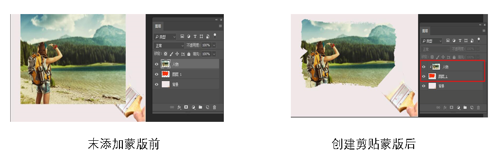选择要添加剪贴蒙版的“人物”图层,执行“图层→创建剪贴蒙版”菜单命令,即可将该图层与下方图层创建一个剪贴蒙版组,如图所示。
