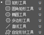 形状工具组可以绘制多种矢量形状,所包含的工具如图所示。可以使用的工具模式有三种:形状、路径和像素。