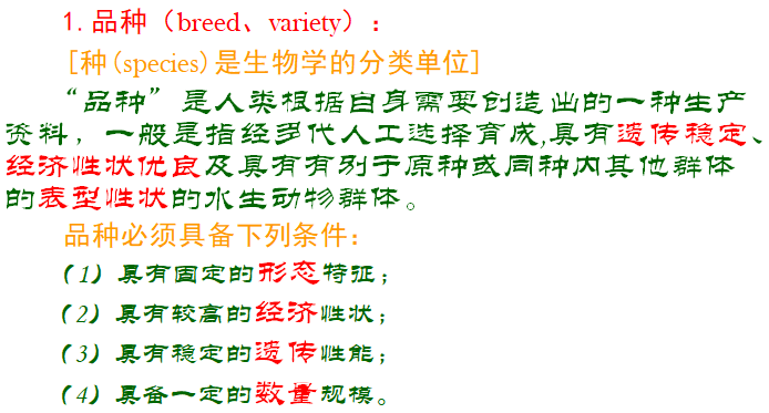指生长快、肉质好、抗逆性强、性状稳定和适应一定地区自然条件并用于增养殖(栽培)生产的水生动、植物种。它必须具备下列性状:优良经济性状遗传稳定在95%以上;其它表型性状遗传稳定在95%以上。