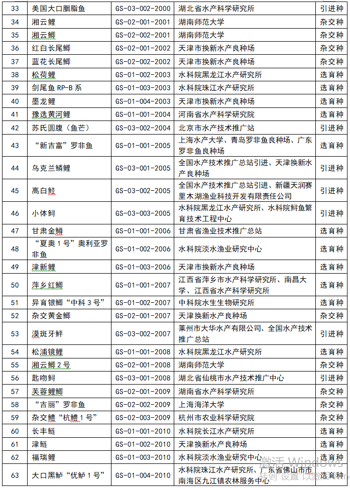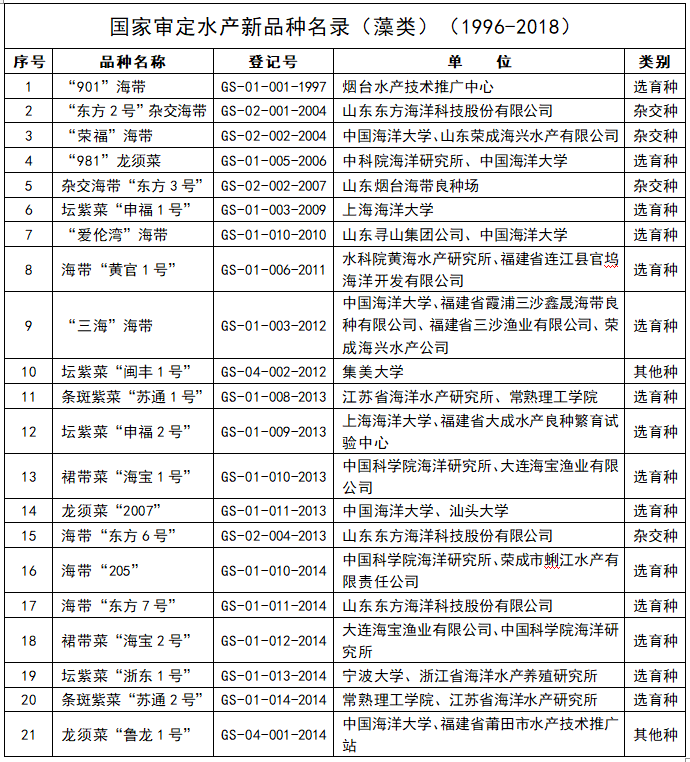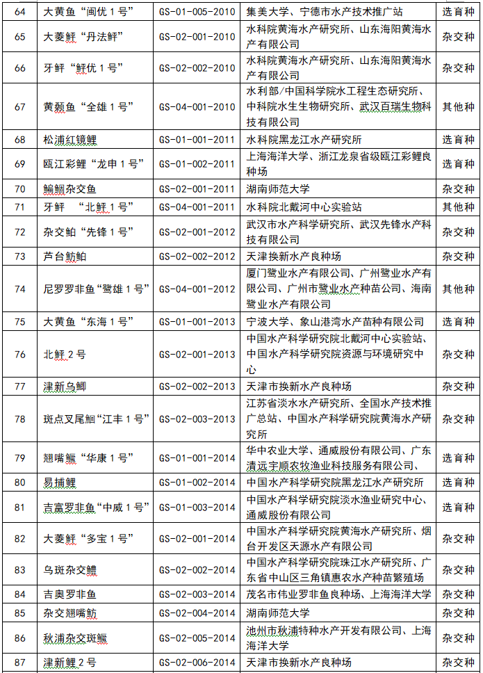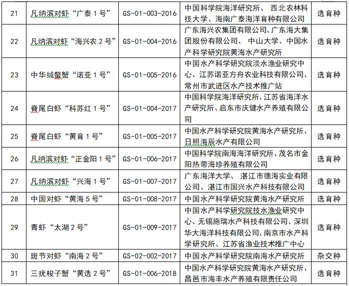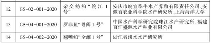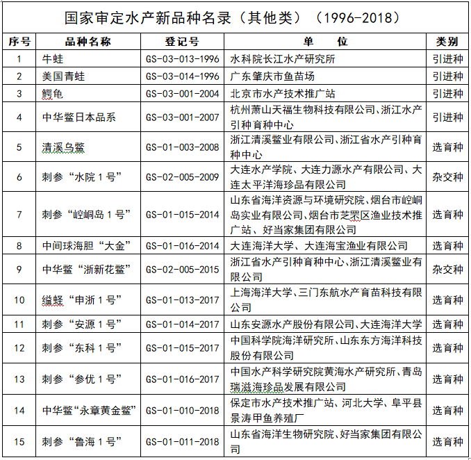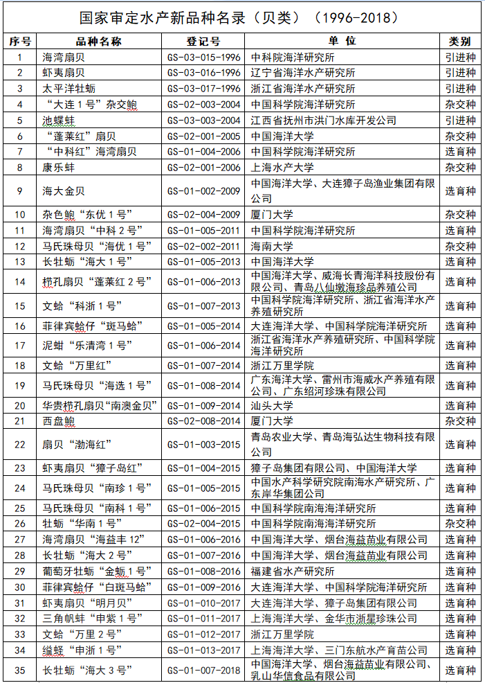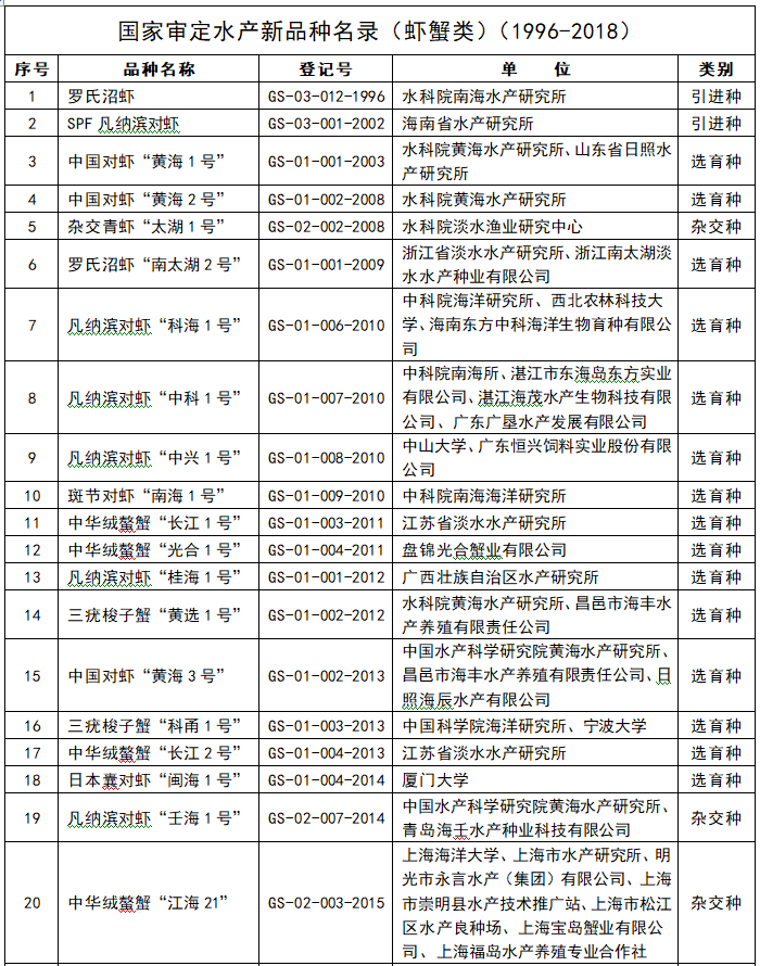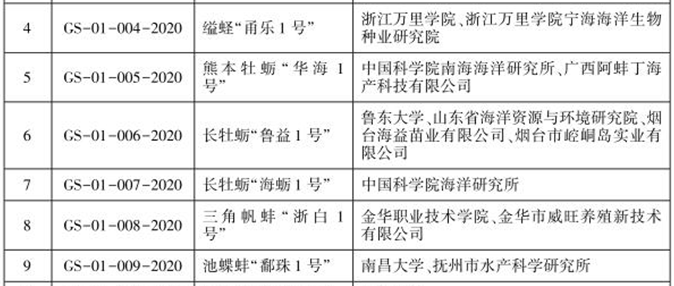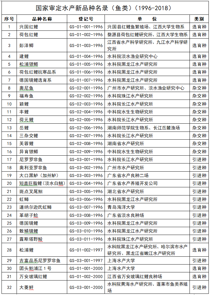 自1996年首次进行水产品种审定以来,至2020年共有229个水产新品种通过了全国水产原种和良种审定委员会的审定(或认定),确认其为适宜在中国水产养殖中推广的品种。如下: