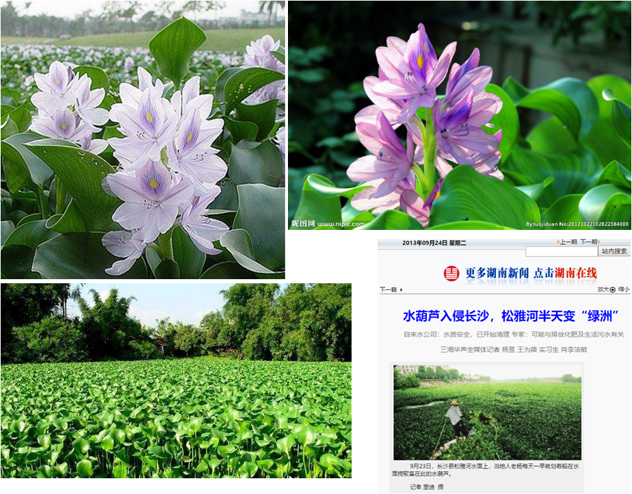 凤眼莲,多年生水草,原产于南美洲亚马逊河流域。1884年,它作为观赏植物被带到美国的一个园艺博览会上,当时被预言为“美化世界的淡紫色花冠”,并从此迅速开始了它的走向世界之旅。 1901年,被引入中国,同时也拥有了一个优美的中文名字“凤眼莲”。它美丽但不娇贵,不但在盆栽的花钵里,在遗弃或扩散到野外时也同样长势旺盛。放眼世界,水葫芦已经广泛分布于北美、非洲、亚洲、大洋洲和欧洲的至少62个国家。