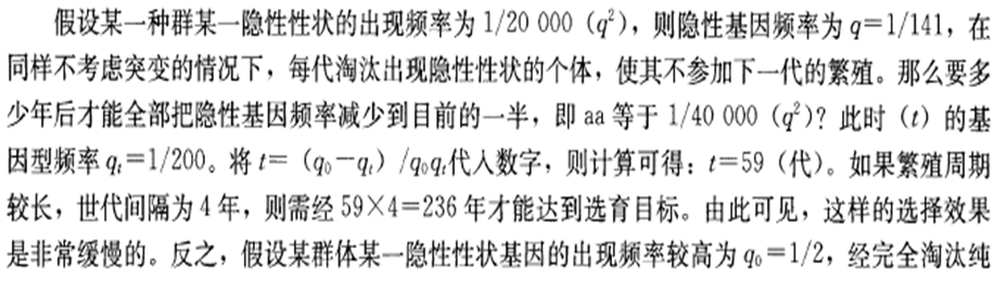若 q0=1/2,经完全淘汰隐性纯合子,要求 qt2=1/2 q02,则t=4代,与上例对比(t=59代),说明什么问题?