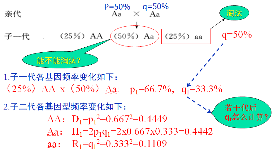 3.亲代为Aa杂合子,繁殖一代后,剔除全部隐性纯合子aa,此时基因频率(p,q)分别是多少?选择种群子二代的基因型分别是多少?请写出演算过程。