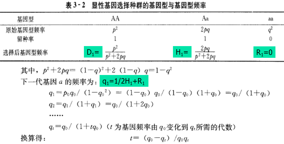 t-公式推断:某原始种群基因型频率分别为:p2(AA)、2pq(Aa)、q2(aa)。则基因频率qt推算如下:
