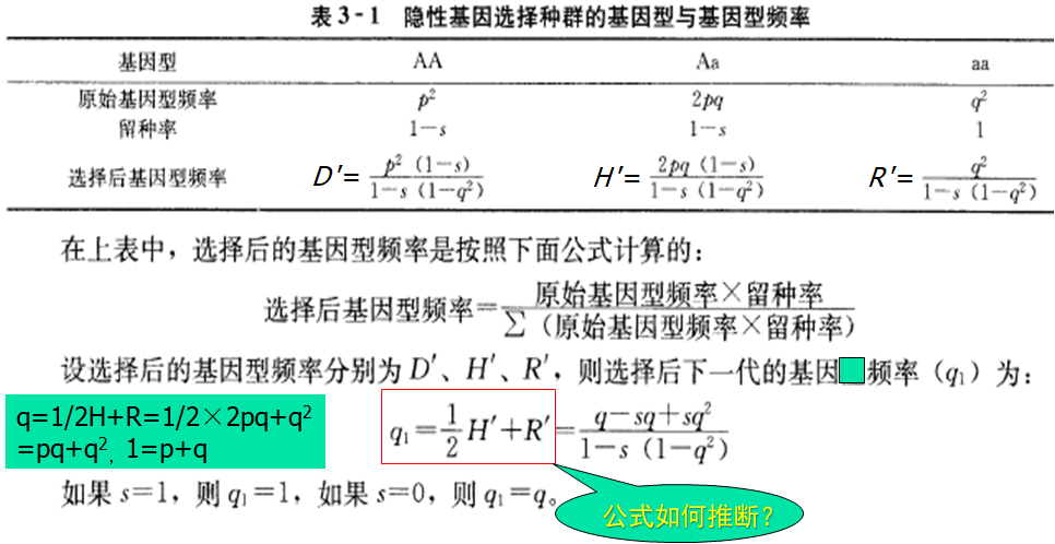 例题1:一对性状基因型为AA、Aa、aa。A对a为完全显性,AA和Aa为显性表型,均表现出A基因性状。假设原始种群基因型频率为:D=p2,H=2pq,R=q2,显性基因型总体淘汰率为s,留种率即为1-s。问选择后下一代的基因型频率及隐性基因频率分别是多少?