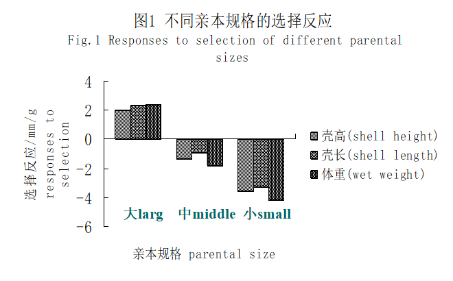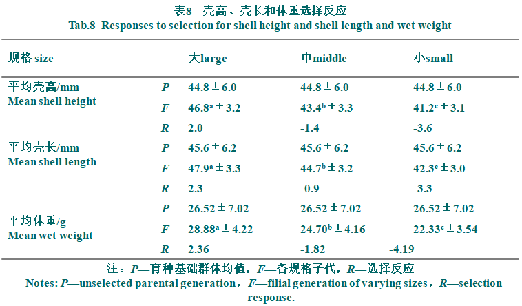 Newkirk等(1983)报道,对二龄欧洲牡蛎(Ostrea edulis)体重进行个体选择,第一代体重平均比对照组高23%;刘志刚等(2007)对墨西哥湾扇贝进行群体选择,正向选择第一代壳高比亲代提高4.5%、体重提高8.9%,选择反应见下表及图。