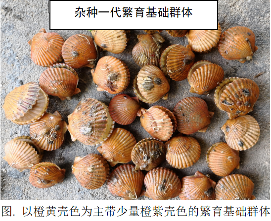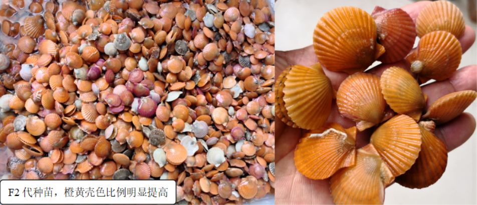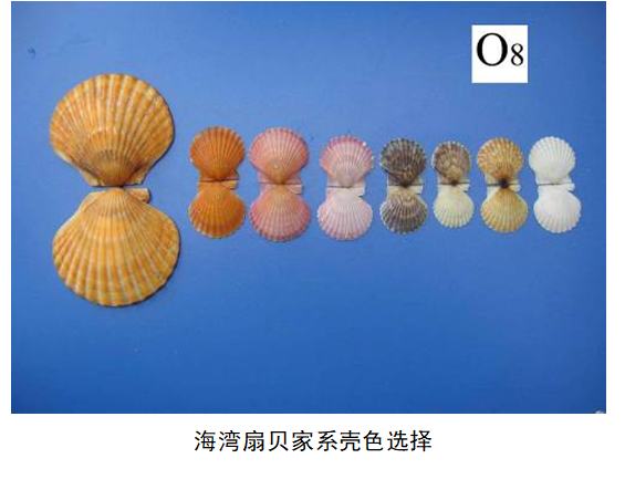 以橙壳色为遗传标记,采用杂交-近(自)交-选择的技术路线,进行生长性状定向选择,从而获得表型标记明显,经济数量性状优良的遗传改良型海湾扇贝养殖新品种。