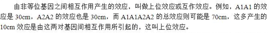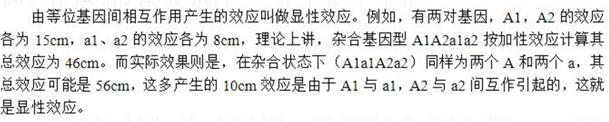 (3)显性基因具有累加效应,如果两个种群各有一部分显性基因而非全部,并且有所不同,则其杂交后代可出现显性基因的累加效应。