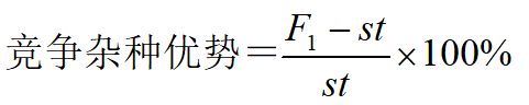 为了经济上鉴定杂种F1的杂种优势,应将杂种F1的经济性状与最优的对照品种 (st) 进行比较,这叫竞争杂种优势。这种杂种优势越大,该组合的实用价值就越高。从中选出竞争杂种优势最大的组合来进一步比较鉴定或推广,其计算式: