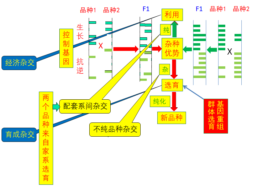 1.经济杂交:又称为杂种优势利用,指杂交后代直接利用,不进行选育的杂交方式,其遗传基础要求杂交亲本目标性状可以互补,且具有一定的纯合度;