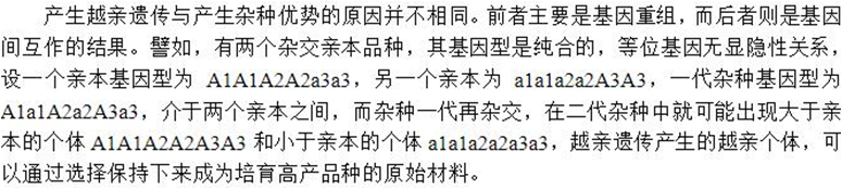 2.育成杂交:对杂交后代进行选育使优良性状逐步纯化和稳定遗传的杂交方式;其遗传基础要求杂交亲本优势性状可以互补,但优势性状具有一定的杂合度,可为杂交选育提供创新空间(见下图);