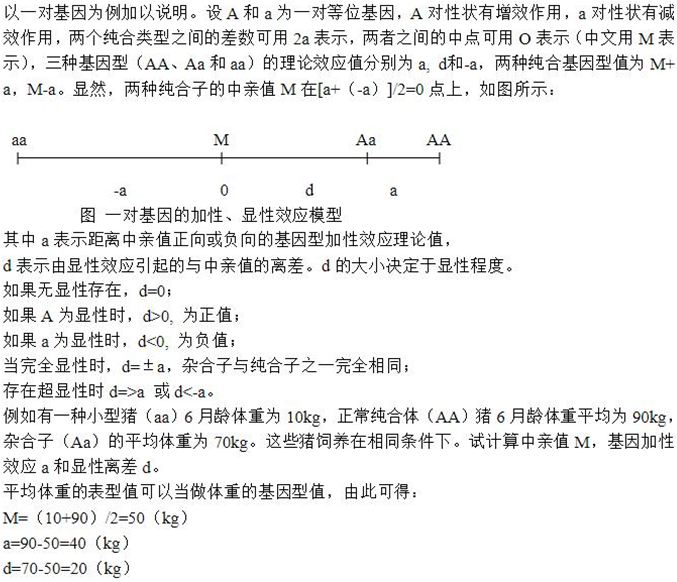 例子:假定猪的日增重由两对基因控制,AA和BB的表型值均为400g,aa和bb的表型值均为200g,A对a、B对b完全显性,因此