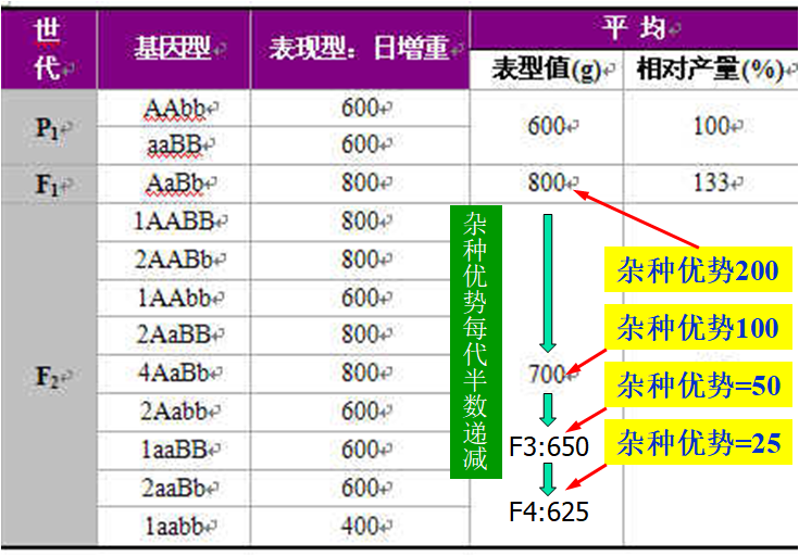 (4)杂种优势在杂种第一代表现最为明显,若杂种不加以选育而直接繁育下一代,则杂种优势半数递减(见下表)。