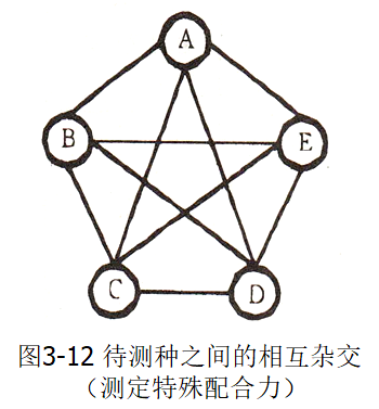是采用相互杂交的方法(图3-12),即将5个待测种互相杂交,然后比较10个杂交组合的正反交平均产量和其他主要经济性状,其中某一特定杂交组合的F1产量最高和其他重要经济性状都很优良,便鉴定出那两个品种之间具有最高的特殊配合力。为减少工作量,可先用顶交法鉴定一般配合力,然后将一般配合力好的优良品种或品系相互杂交,鉴定其特殊配合力,据此来确定单交、三杂交和四杂交种的杂交方式。