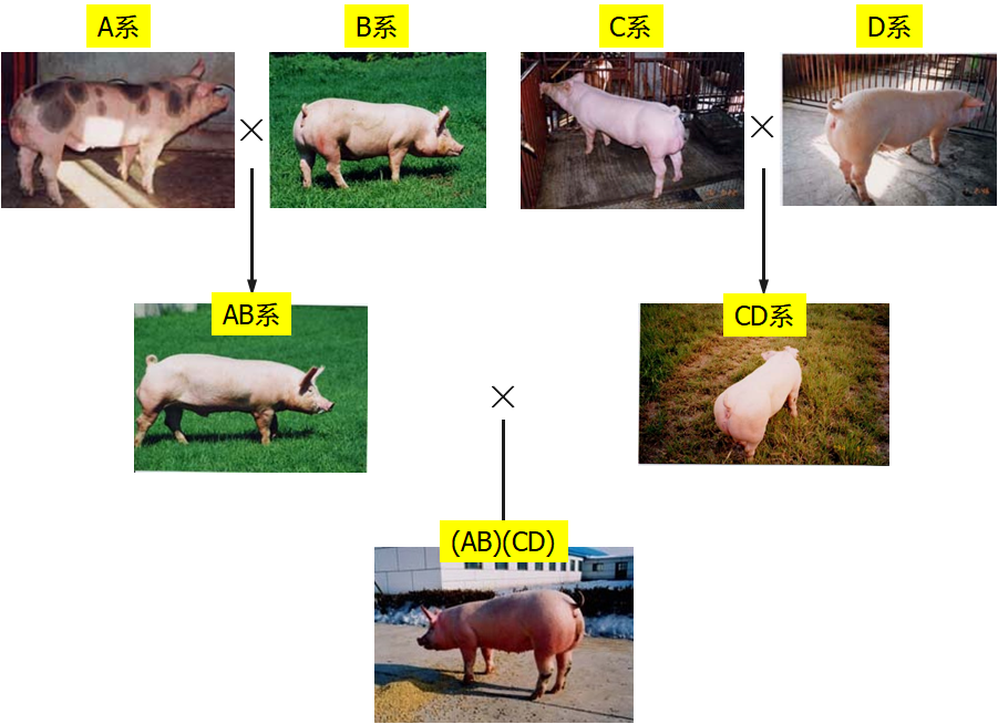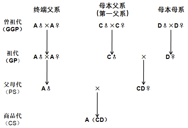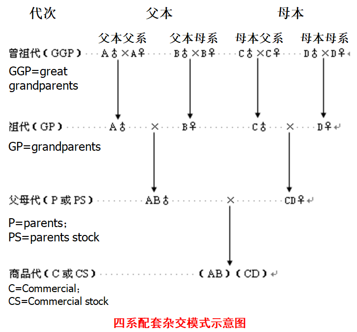 (5)四系套配:四个品系每两个品系进行杂交,分别产生父代与母代,将四个系的优良特性分别集中在父代与母代身上,又通过父代与母代杂交,产生商品代,这样就将优良性状都集中到了商品代身上,这就是四套配系(下图)。