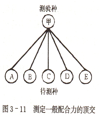 为了获得强杂种优势组合,在配制杂交组合时,必须使用配合力测定这一技术。对一般配合力的测定,采用顶交方法,如有A, B, C, D 及E 5 个待测种(也叫预测种)分别和一个共同的测验种甲杂交(图11)。测验种一般用中上等产量水平的品种,然后在相同条件下比较甲XA、甲XB、甲XC、甲XD及甲XE 5个杂交组合的正反杂交种的平均产量。高产组合则表示那个和测验种顶交的待测品种有较好的一般配合力;反之,低产组合则表示该品种的一般配合力差。
