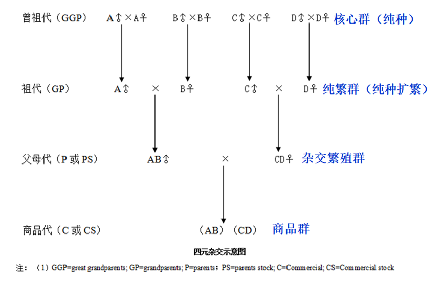 杂交繁育体系一般含四个层次,即核心群、纯繁群、杂交繁殖群和商品群。