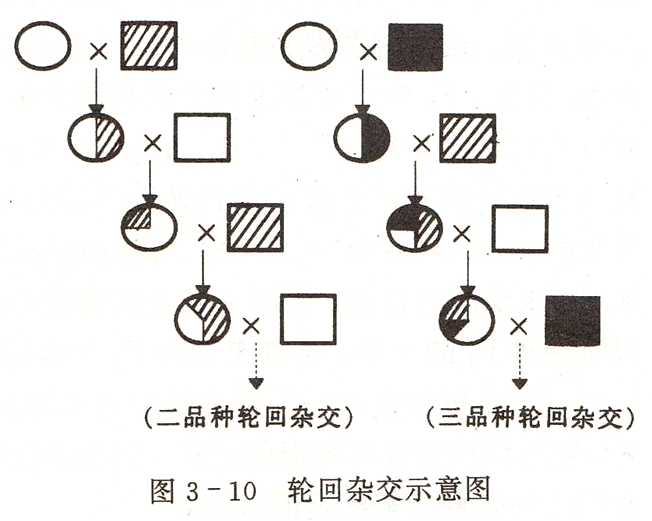 现以A、B、C三品种为例进行说明:先用A与B两品种杂交,所产后代都具有杂交优势,大部份加以宰杀,仅留少部分优良母畜,长大后再用C品种公畜与之交配;所产第二代杂种,又仅留少量母畜,长大后再用A品种公畜与之杂交;所产第三代杂种,又仅留少量优良母畜,又用B品种公畜与之杂交,这样就轮回杂交了一次了。以后所产第四代杂母又先用C公畜,然后第五代杂母用A公畜,第六代杂母用B公畜杂交,这样用C、A、B公畜轮流杂交下去,这就是轮回杂交。