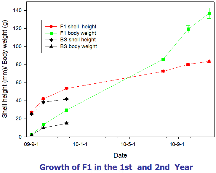 由下图可见,海湾扇贝在2009年12月就基本完成生命周期,而杂种F1则一直延续至2010年12月,期间一直在生长。说明杂种后代生命周期比海湾扇贝至少延长1年,可以利用这个特性培育大规格产品,从而提高养殖经济效益。