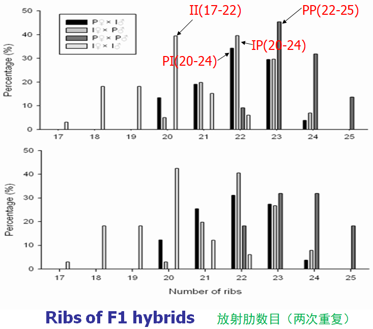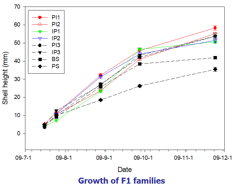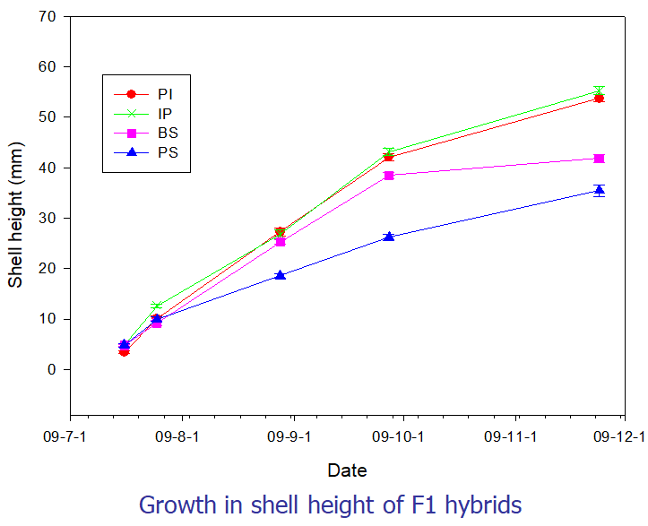 ①壳高生长速度:下述第1图为群体杂交,PI、IP生长速度接近,且两者明显大于BS和PS,PS最低的原因在于高温抑制其生长。下述第2图为家系杂交,各家系生长速度总体趋势与第1图相似。说明两个品种的杂种优势是明确存在的,至少中亲优势是存在的,至于是否存在超亲优势,却由于紫扇贝生长受到高温抑制而无法比较。