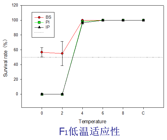 从下述两个图可见,杂交后代对温度的适应性处于两个亲本的均值左右,48h半致死温度低温为3℃,高温为29℃。杂交后代的适温性由紫扇贝的6-26 ℃拓展至3-29 ℃,使紫扇贝优秀基因得以在更广泛的温度范围内表达。